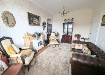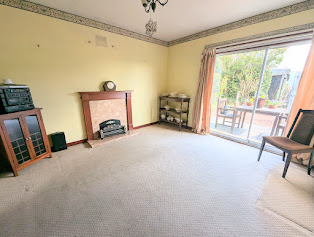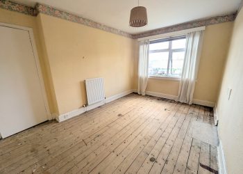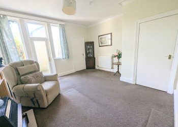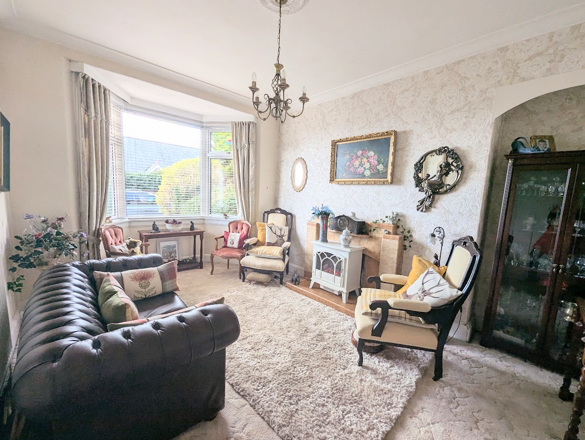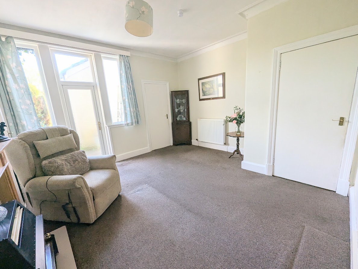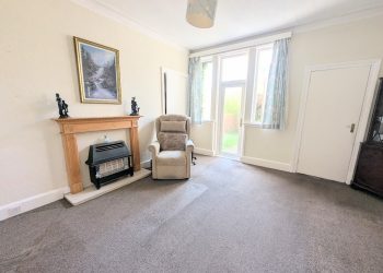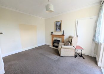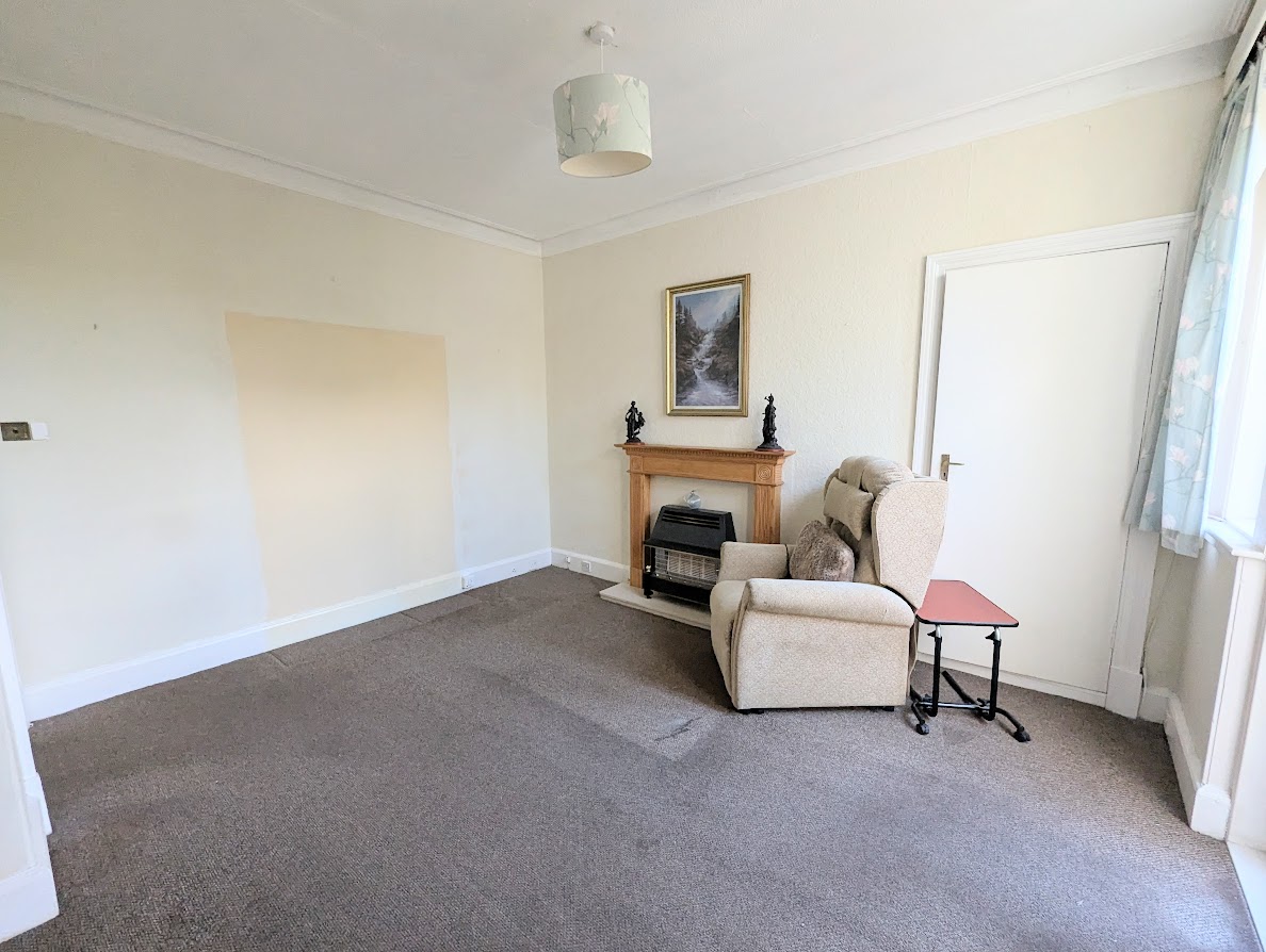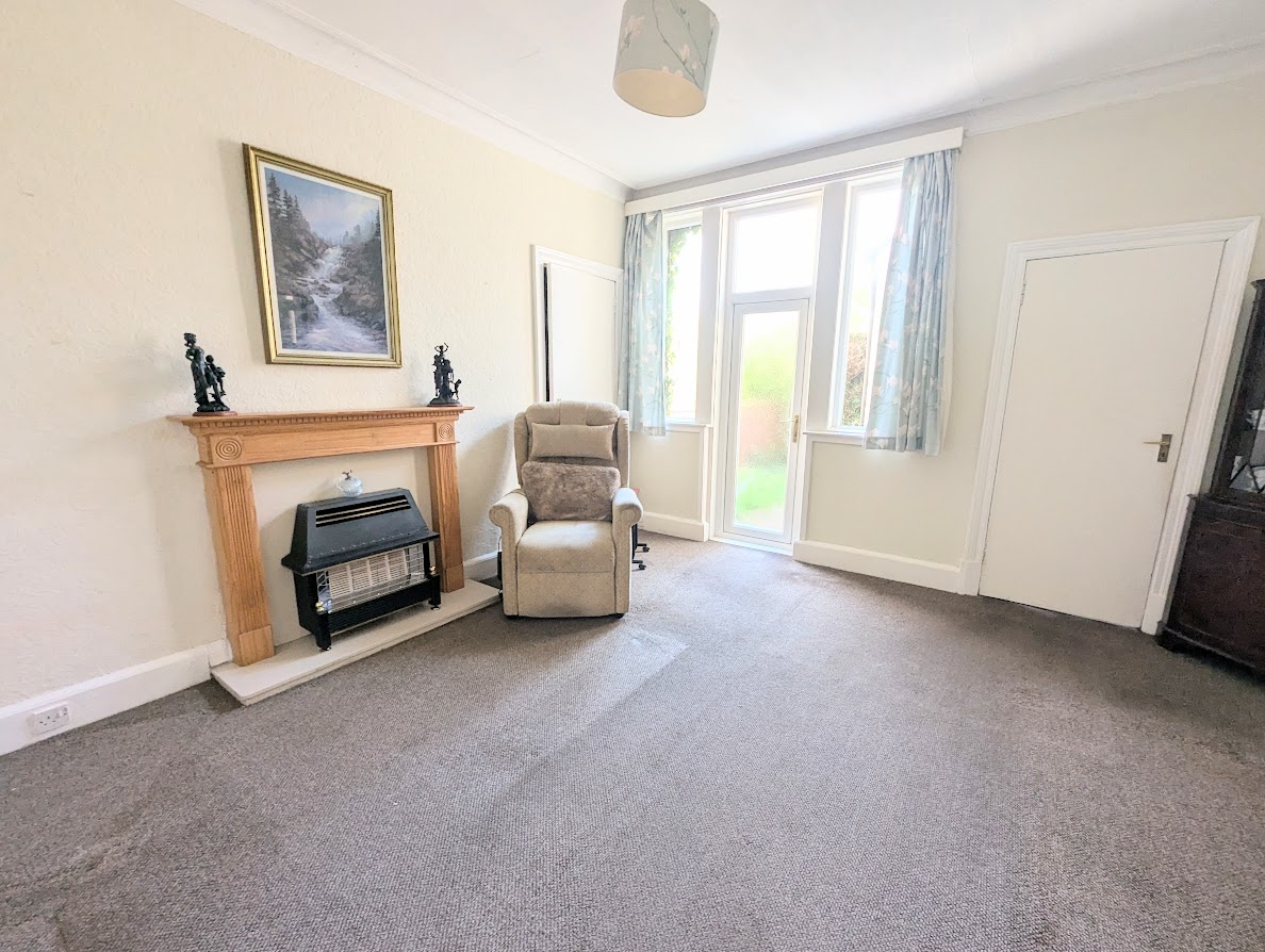 Living room which is a good size with windows and door to rear. Gas fire with wooden mantle. Built-in cupboard with shelves.