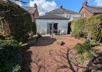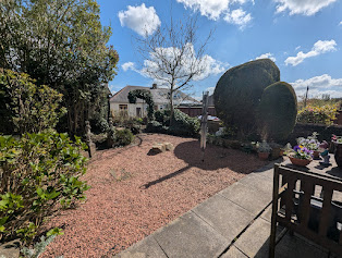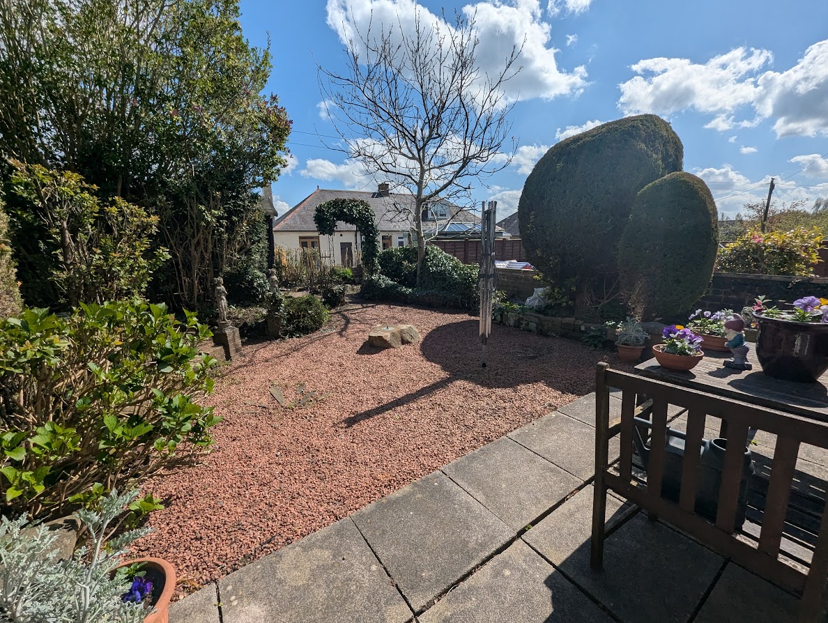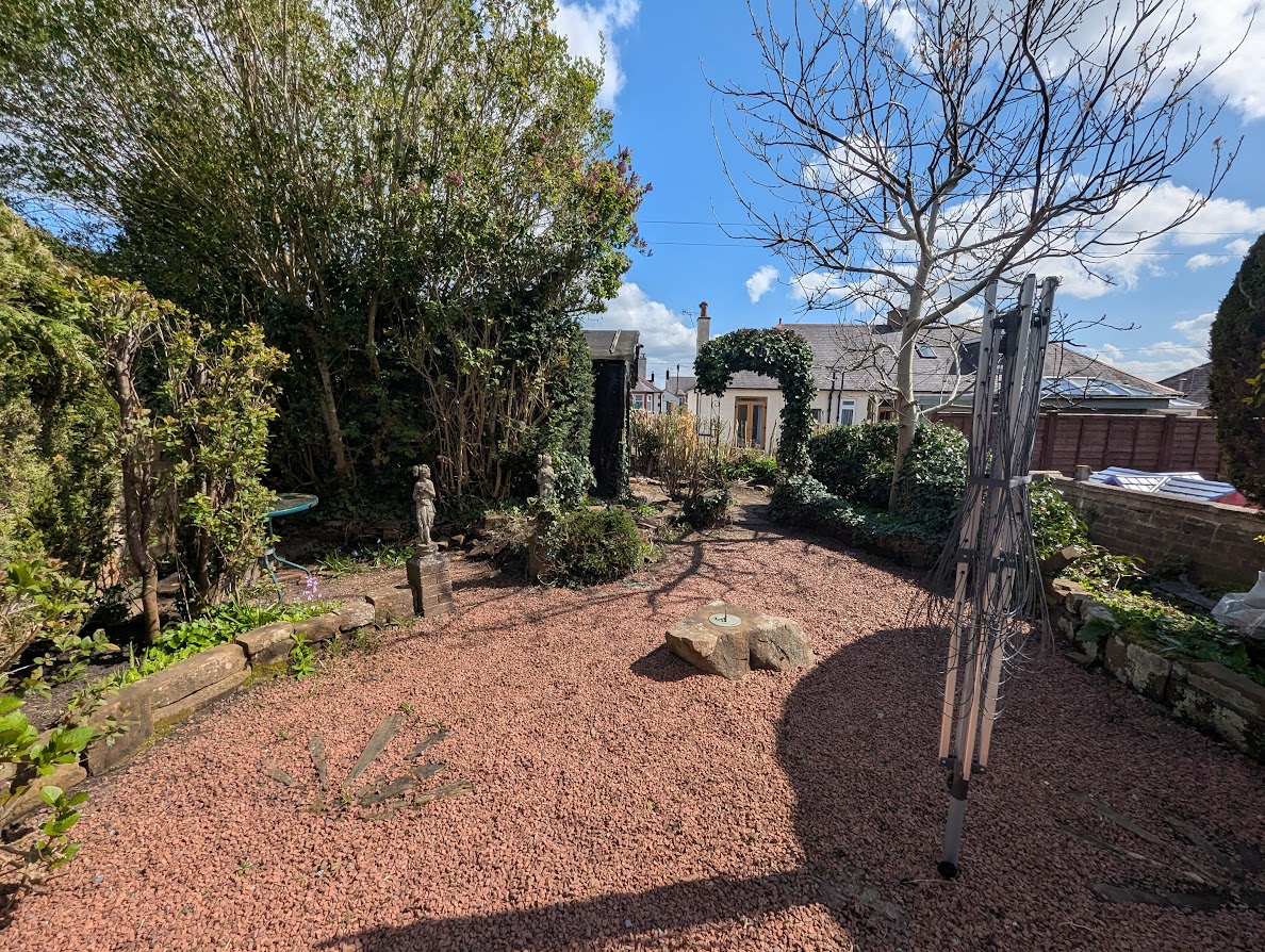 Front garden laid to stone chips and shrubs. Path to the side leading to the rear. Rear garden is a good side, patio area, clothes whirly. Shed. Various plants shrubs and bushes.