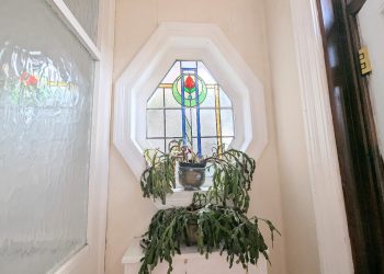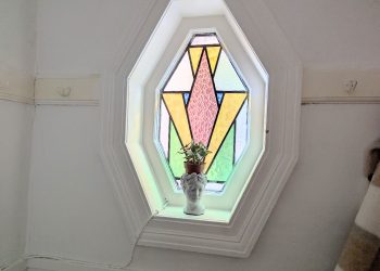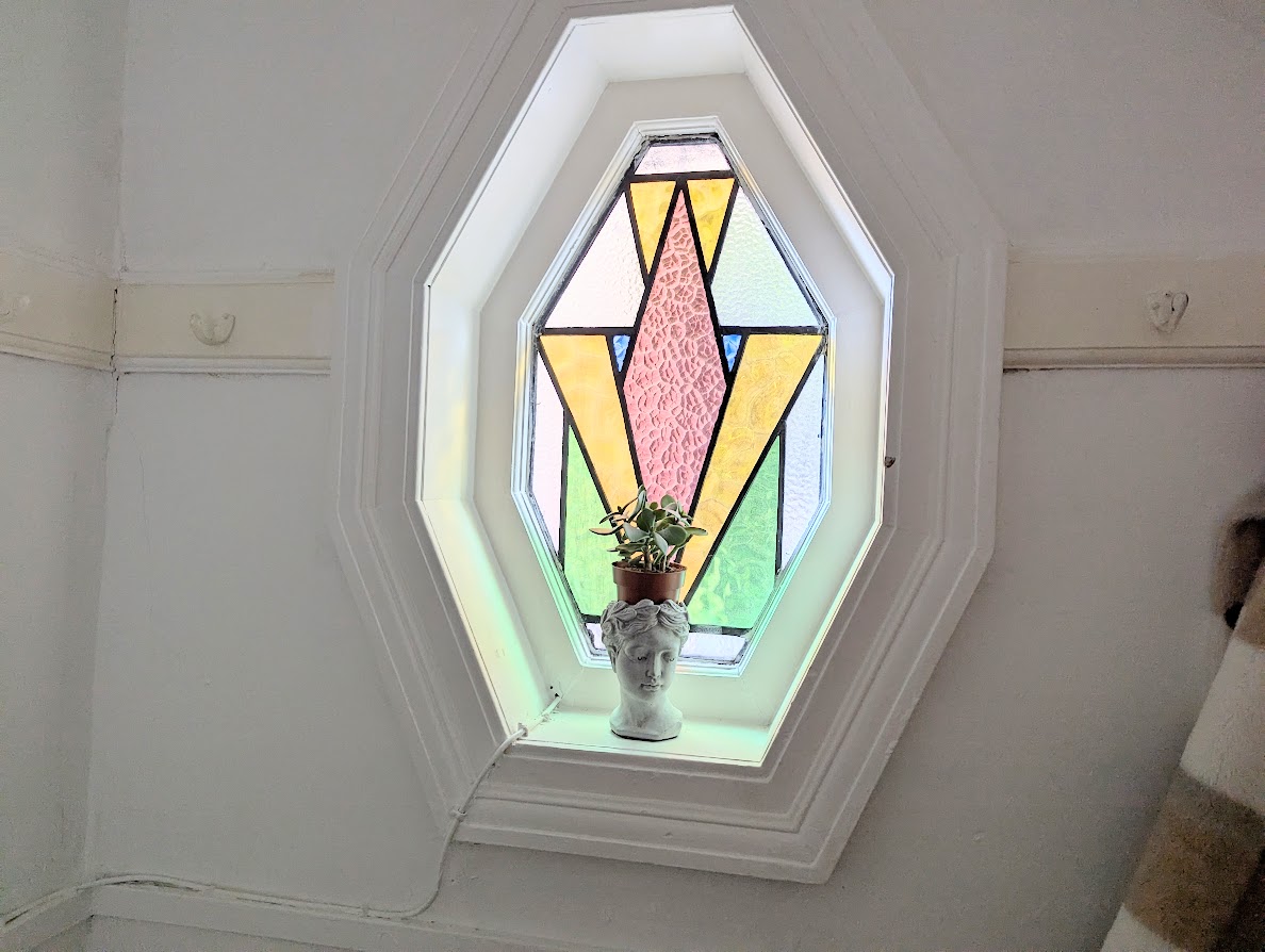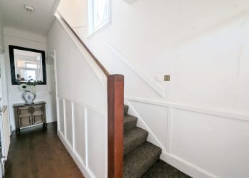 Large hallway under stairs cupboard, coat hooks and stained glass window to side. Door to sitting room, living room and stairs to first floor.