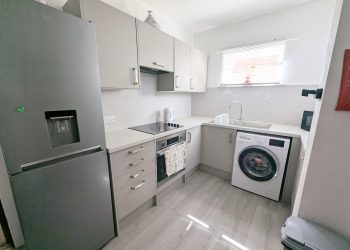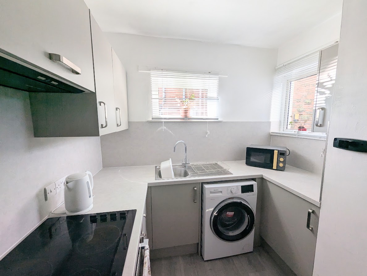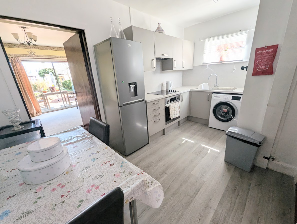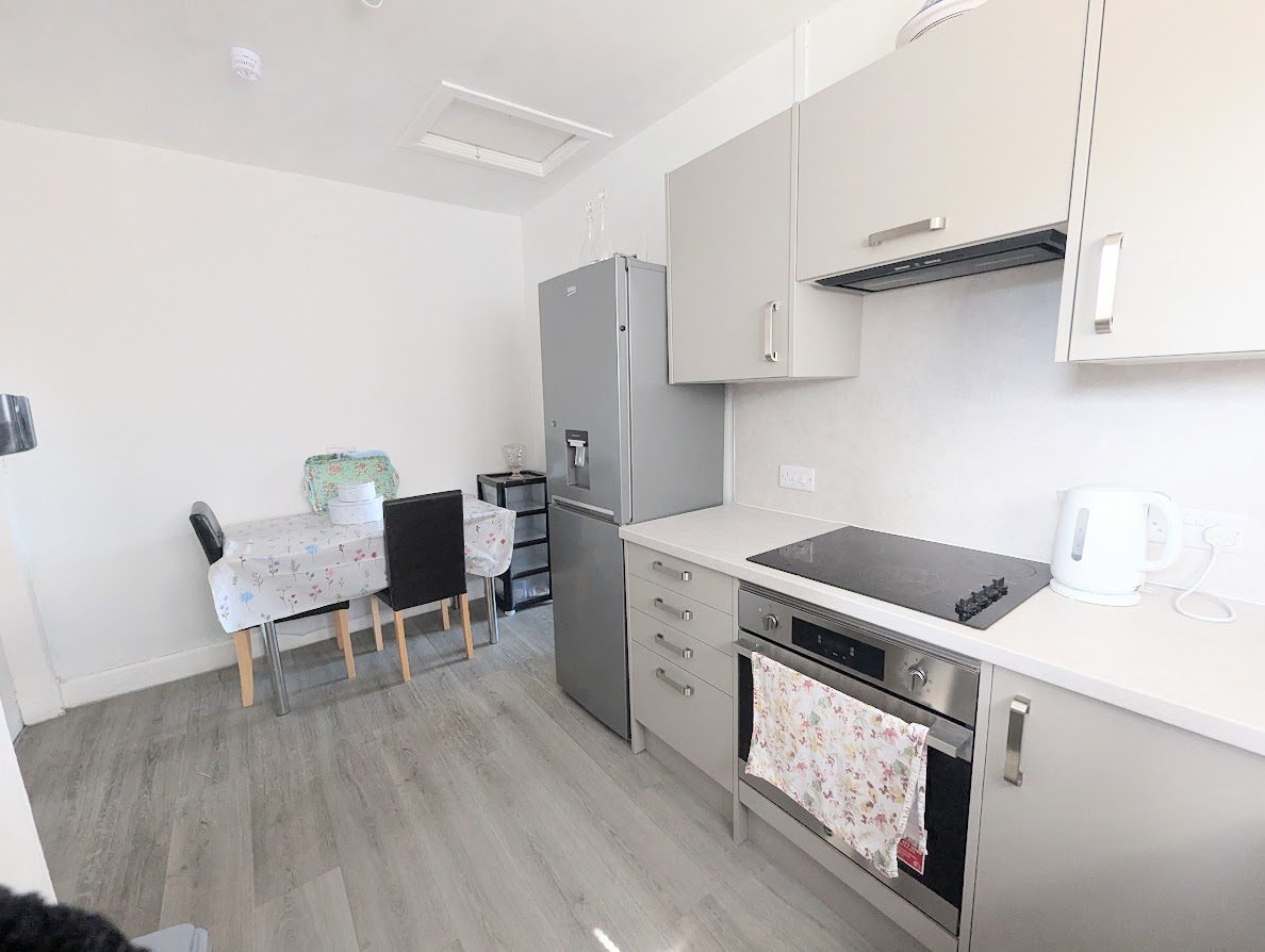 Modern fitted kitchen with wall and base units. Sink with mixer tap and right hand drainer. Integrated electric oven and hob with extractor fan. Window to side and front. Loft hatch.