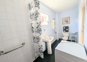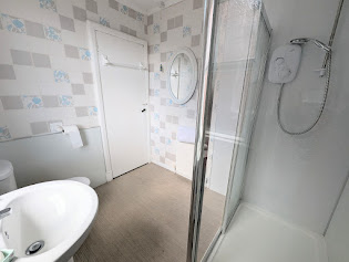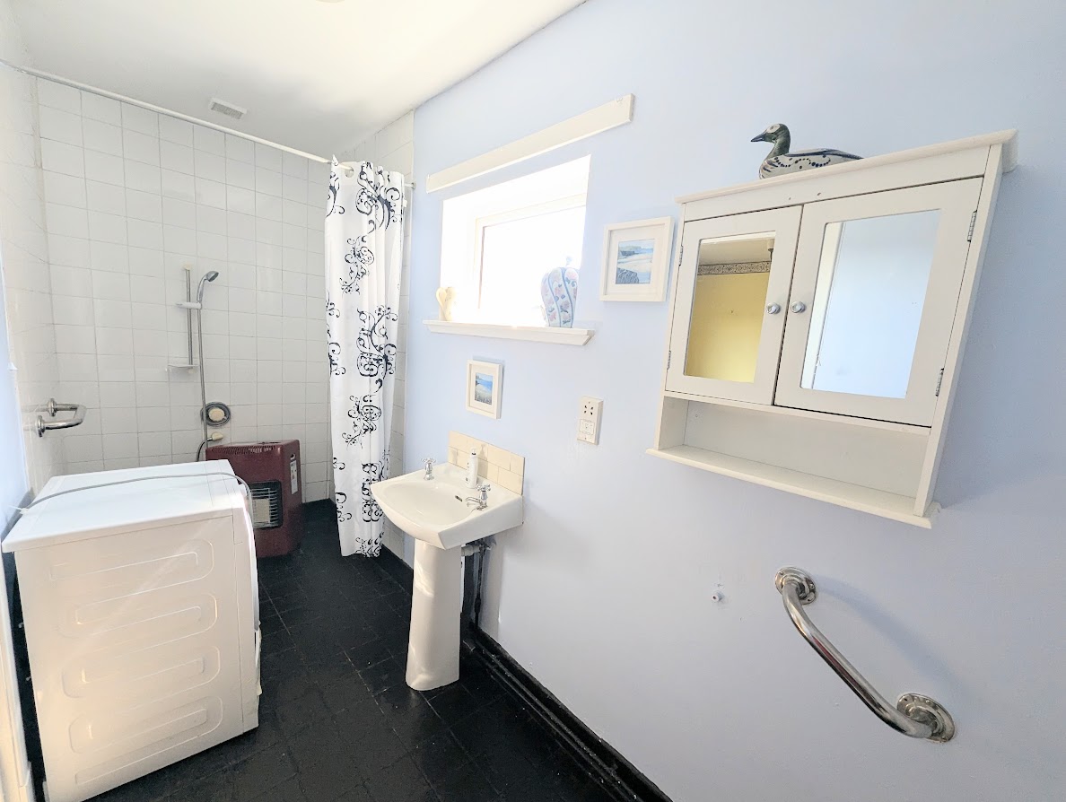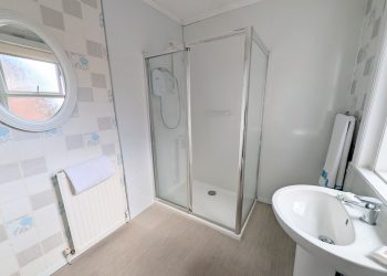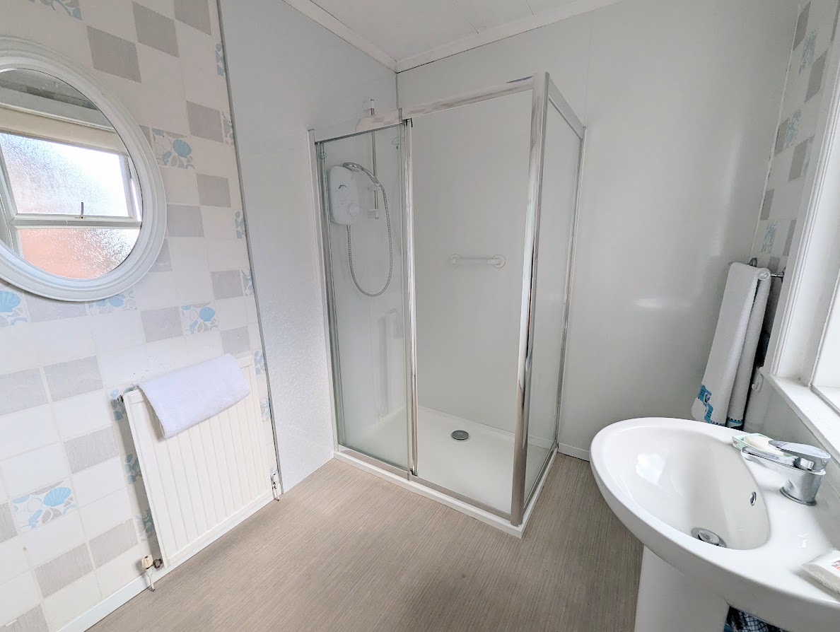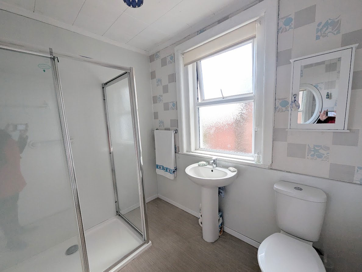Shower room with shower cubicle with Mira shower, W. C. and wash hand basin with mixer tap. Part waterproof splashback. Window to side.