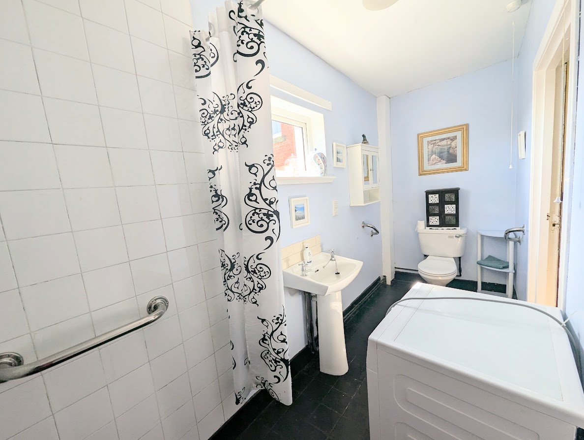 Wet room with W. C., wash hand basin and shower. Tiled floor. Window to side.
