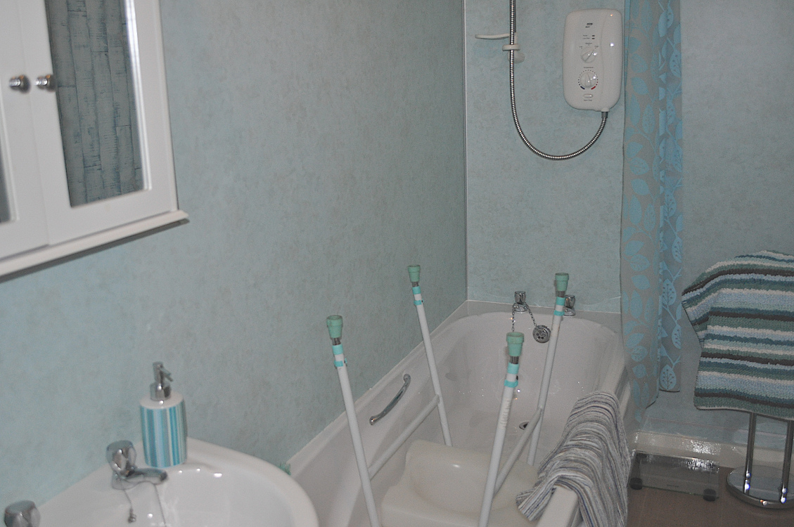 Bath with Mira Sports electric shower unit above and laminate surround. WC and wash hand basin. Cornicing. Central heating radiator. Wood effect vinyl flooring.
