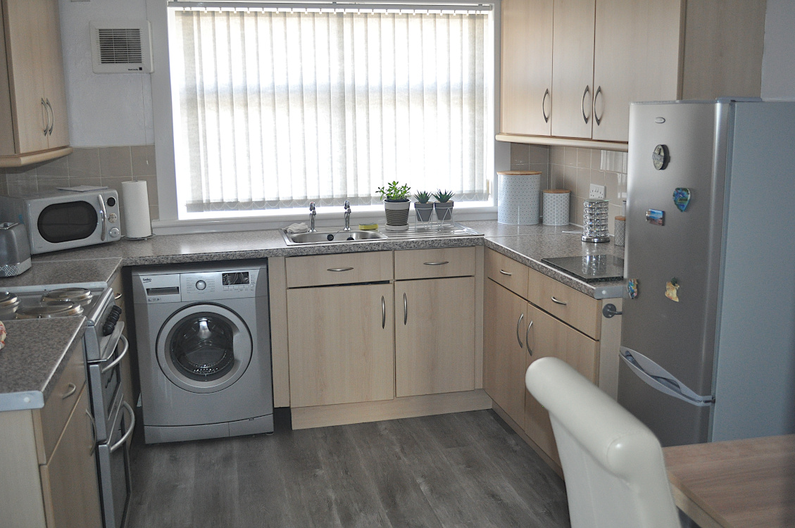 Beautifully presented kitchen with a wide range of work tops, base units and wall cupboards. Single drainer sink unit. Double glazed windows with fitted blinds. Wood effect laminate flooring. Central heating radiator. Plumbed for washing machine. 6 x 13 amp power points. UPVC double glazed frosted glass panelled door to the rear. The fridge freezer, washing machine and cooker may be available by separate negotiation.
