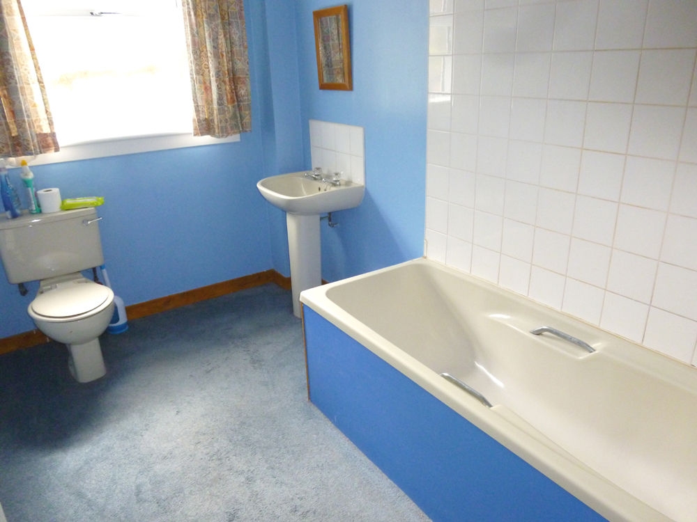 Bathroom with bathroom suite consisting of bath with tiled surround and electric shower unit above, WC and wash hand basin. Fitted carpet. Electric radiator. Double glazed frosted glass window.