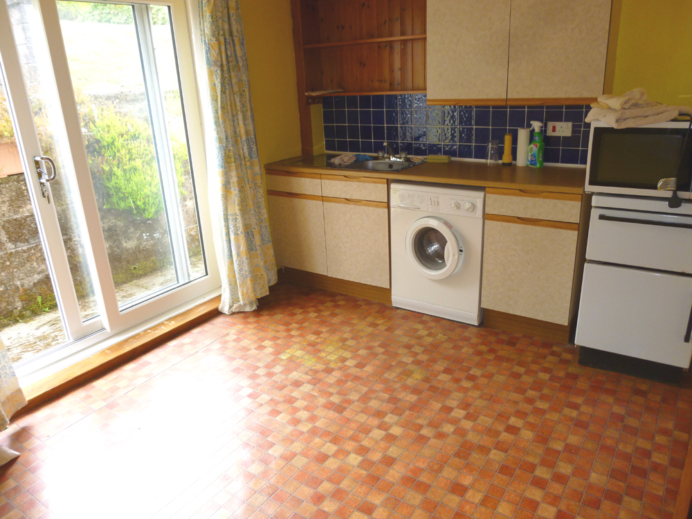 Spacious dining kitchen with a range of work tops, base units and wall cupboards. Tiled splashback. Single drainer sink unit. Washing machine included in sale. Electric radiator. Tile effect vinyl flooring. 6 x 13 amp power points. Double glazed sliding door and panel to the side leading to the rear garden.