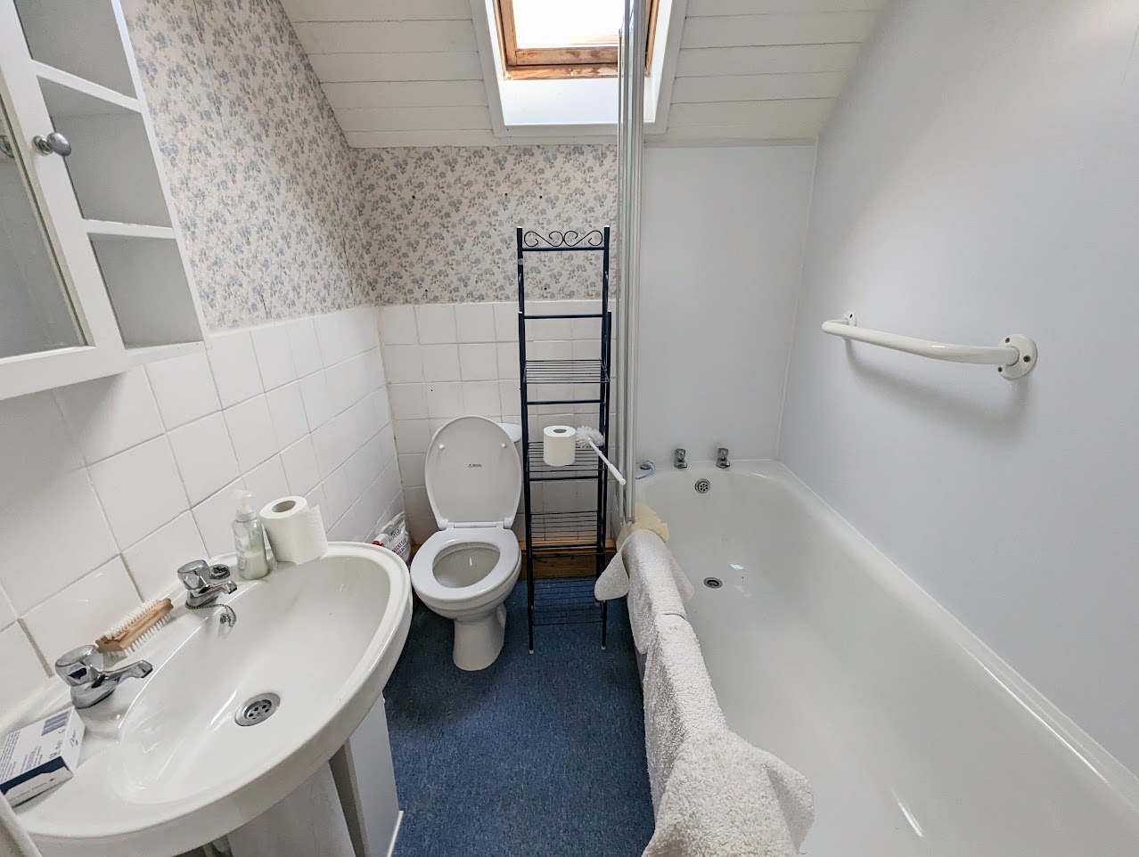 Bathroom with W. C., bath and wash hand basin. Part tiled and part splashback. Velux window. Loft hatch.