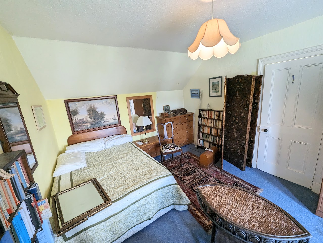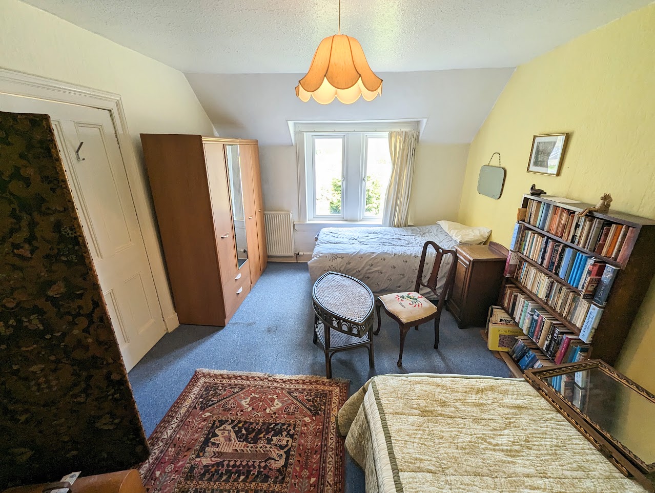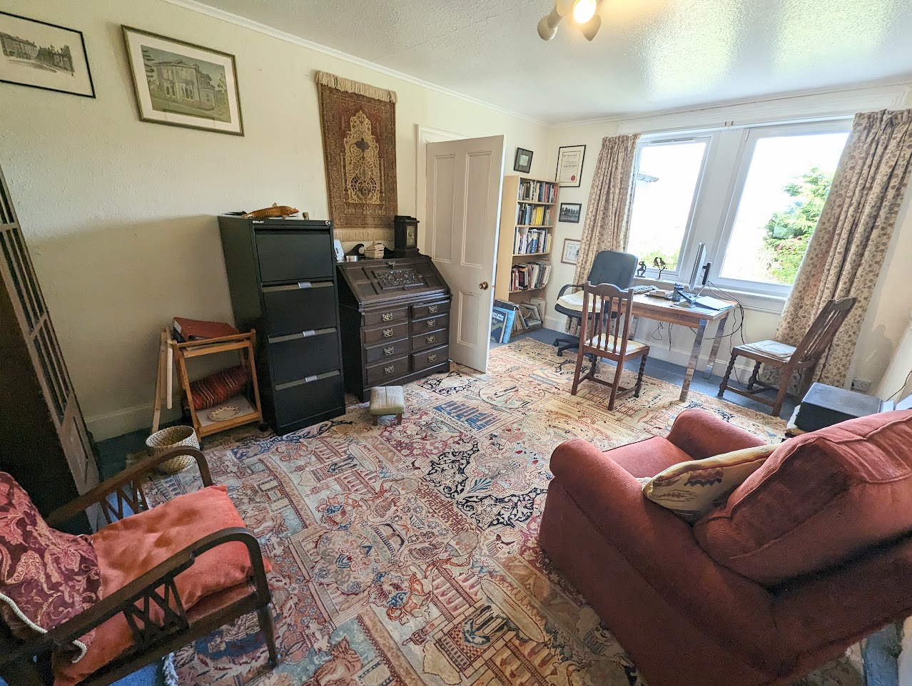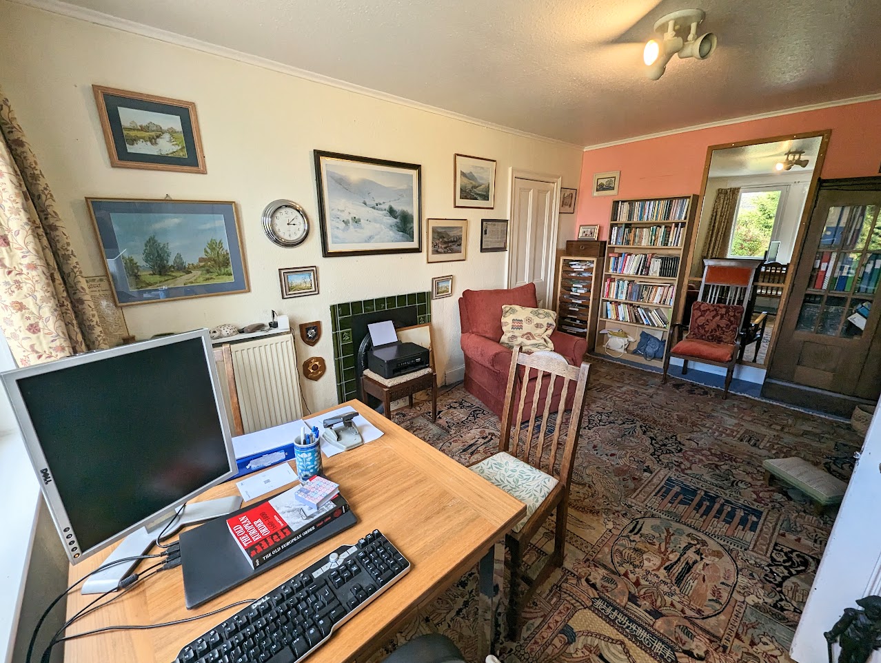 Bedroom 1 currently used as a dining room/study with windows to the front. Fireplace with tiles. Built-in cupboard with shelves.
