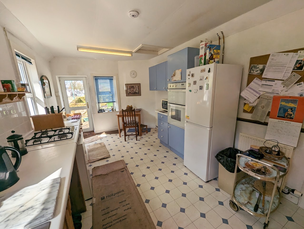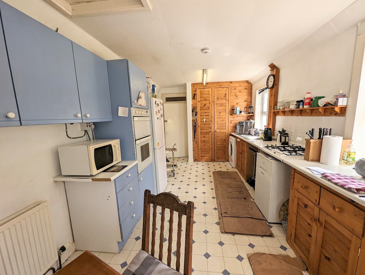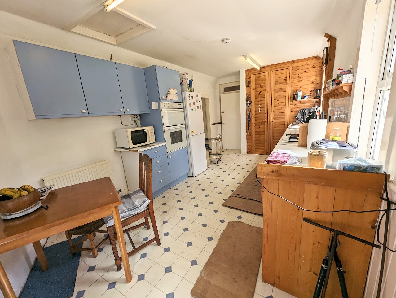 Fitted kitchen with wall and base units, sink with left hand drainer. Integrated double oven. Fridge/freezer and washing machine. The windows and door to rear. Loft hatch. Two built-in shelved cupboards.