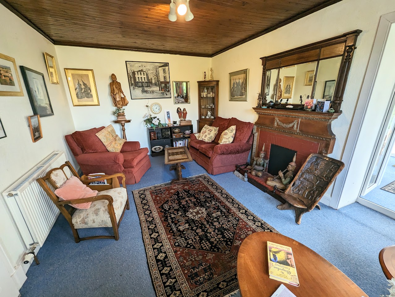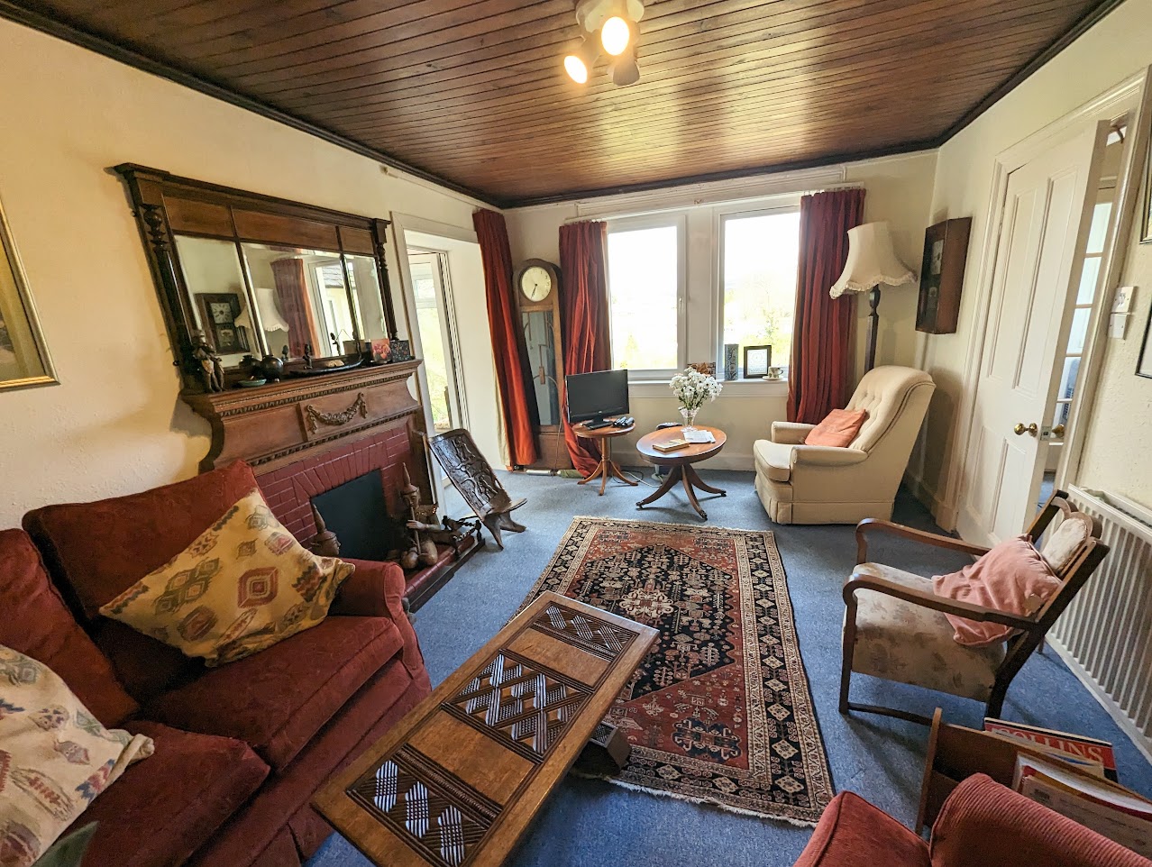 Bright living room with windows to the front. Decorative wooden fireplace with mirror and tiled hearth.