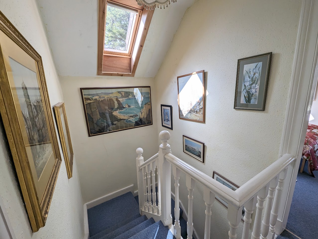 Stairs to first floor with handrail and bannister. Skylight window. Doors to two bedrooms and bathroom.