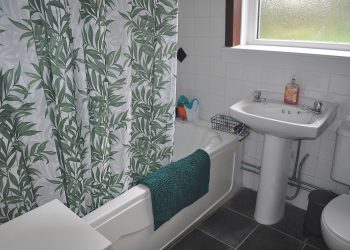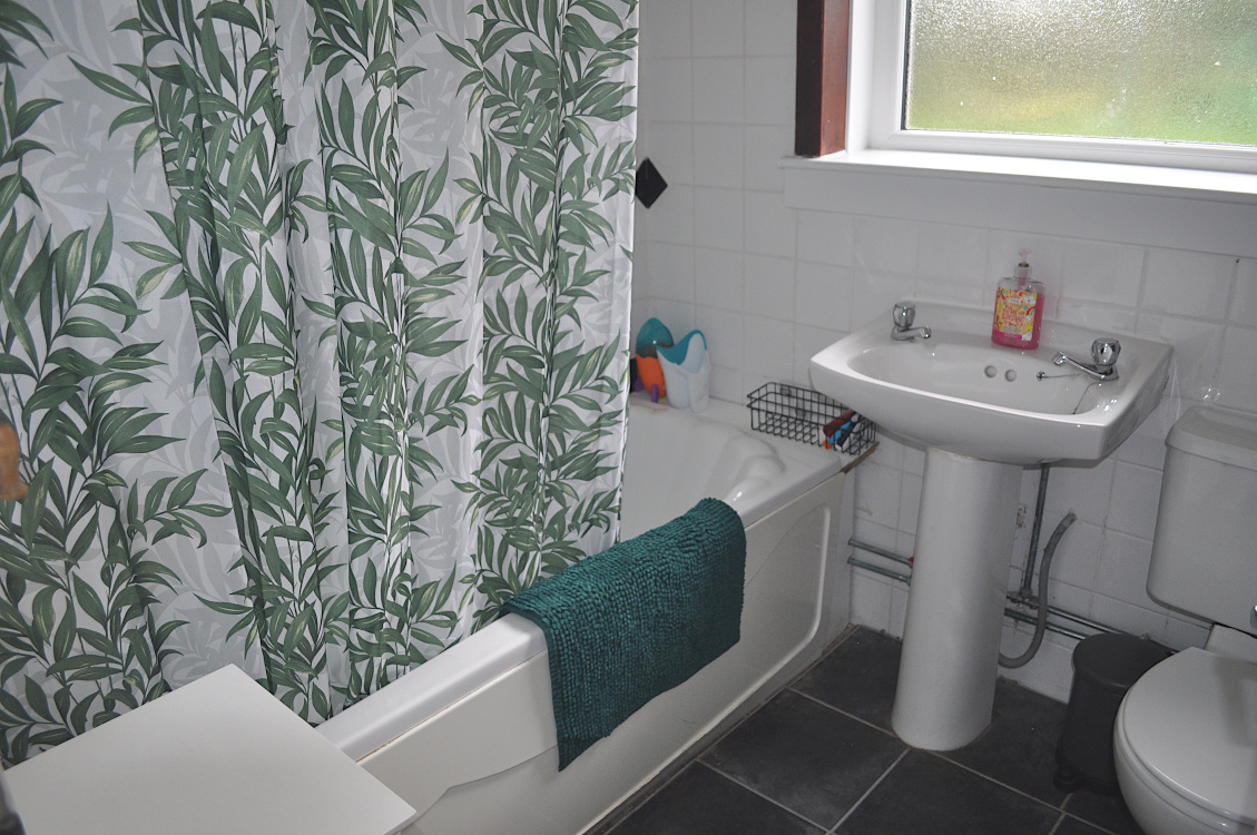 WC, wash hand basin and bath with electric shower unit over. Double glazed frosted glass window with fitted roller blind. Tile effect laminate flooring. Central heating radiator.