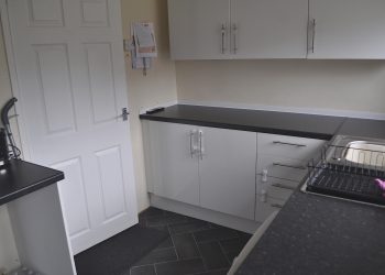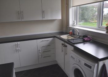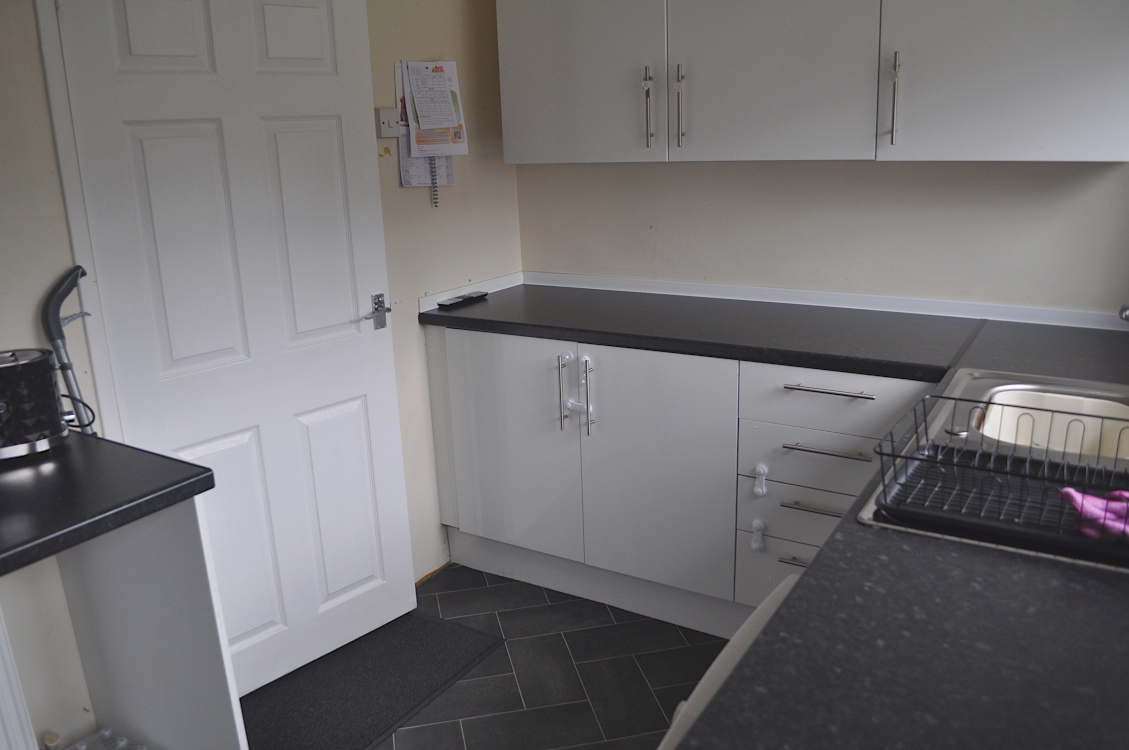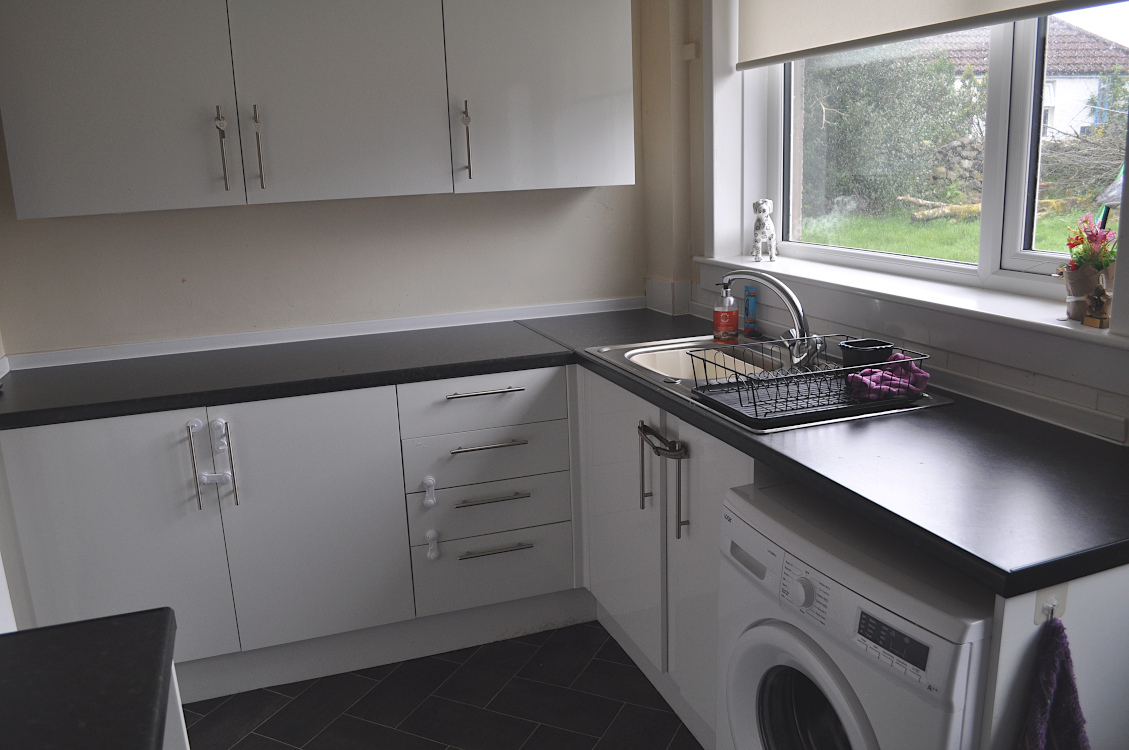 Wide range of work tops, base units and wall cupboards. Integrated four burner electric hob with oven below. Single drainer sink unit. Breakfast bar. Central heating radiator. Tile effect vinyl flooring. Double glazed windows to the rear with fitted roller blind. Door to the rear garden. 4 x 13 amp power points. Strip light.