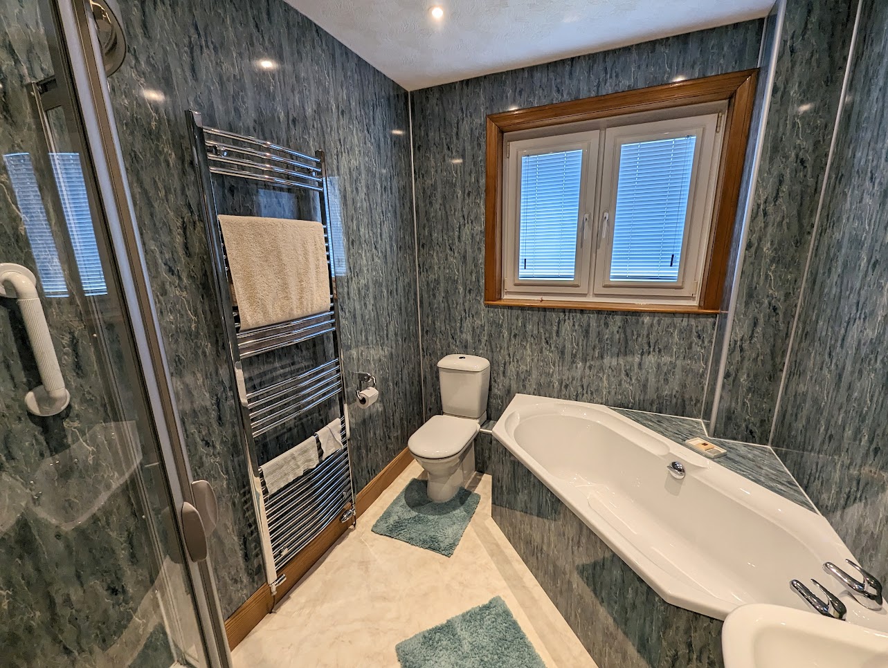 Good size bathroom with wash hand basin with mixer tap, bath, W. C. and shower cubicle. Respatex walls, window to the rear and heated towel rail.