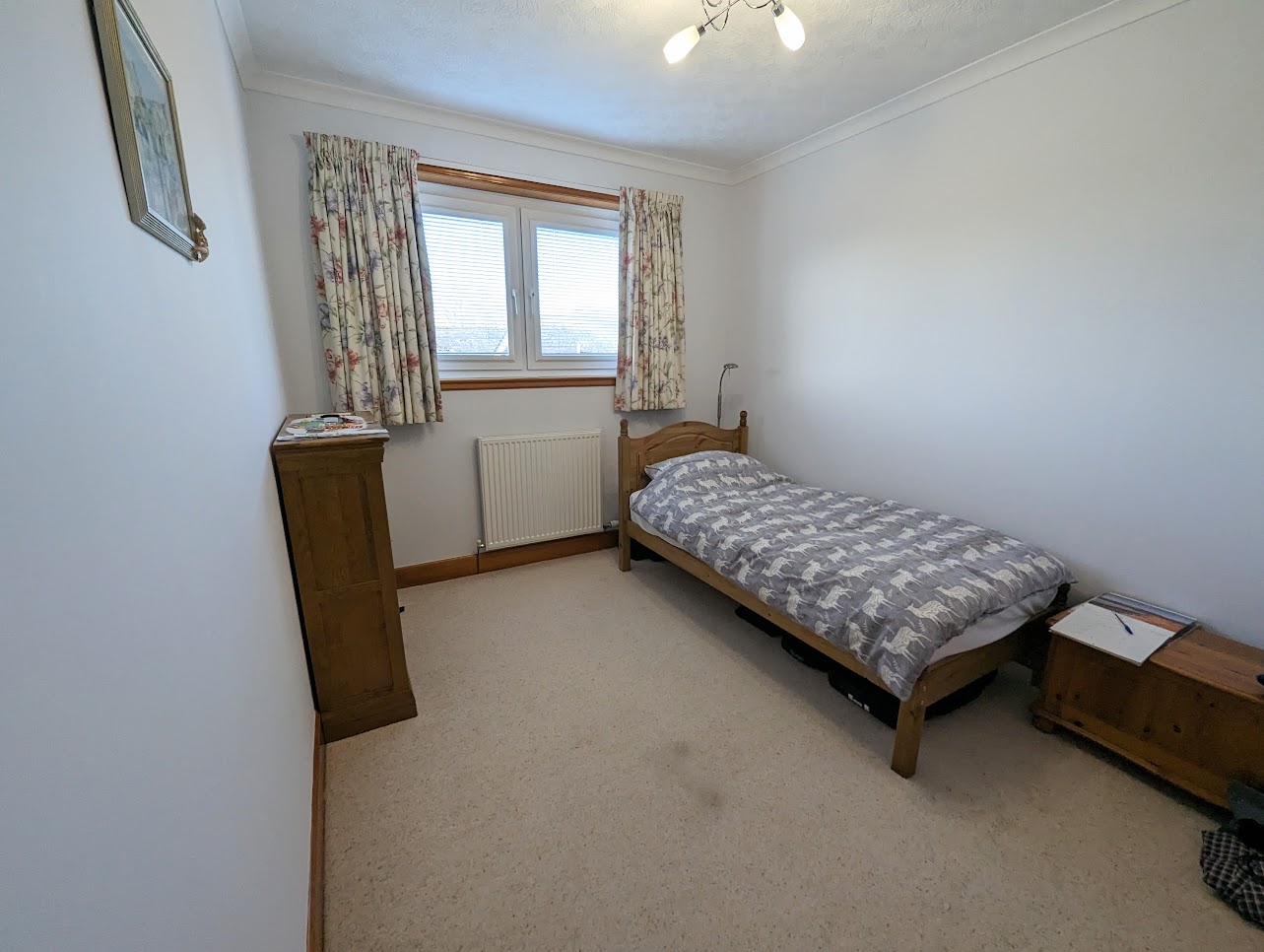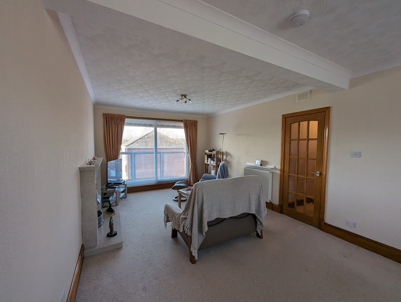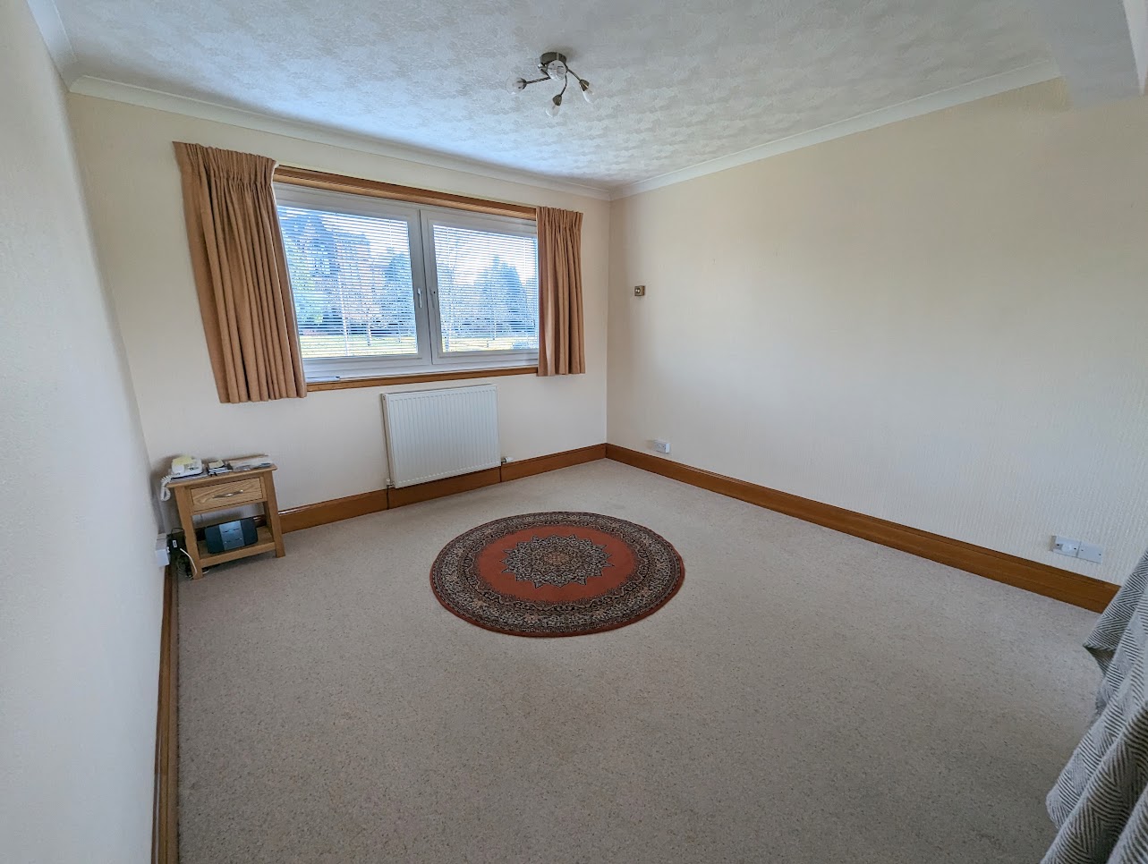 Bright and spacious living room/dining room with windows to the rear and patio door to the front opening up onto a balcony giving views over the River Nith. Electric fire with marble hearth and surround.