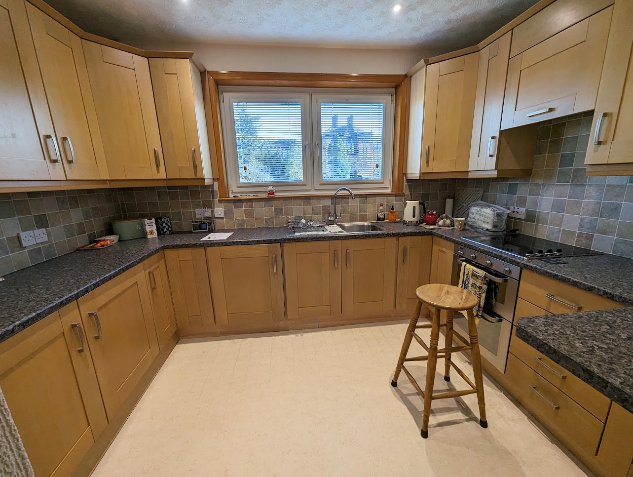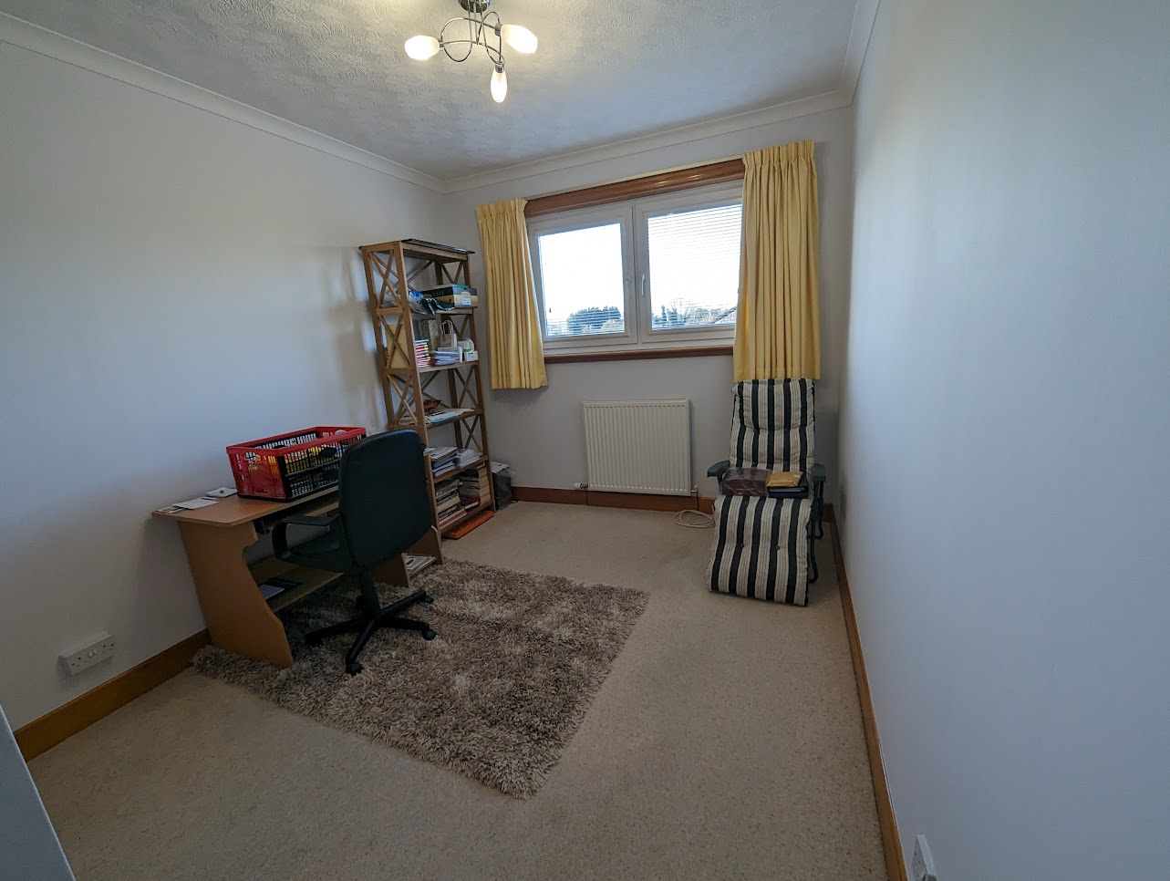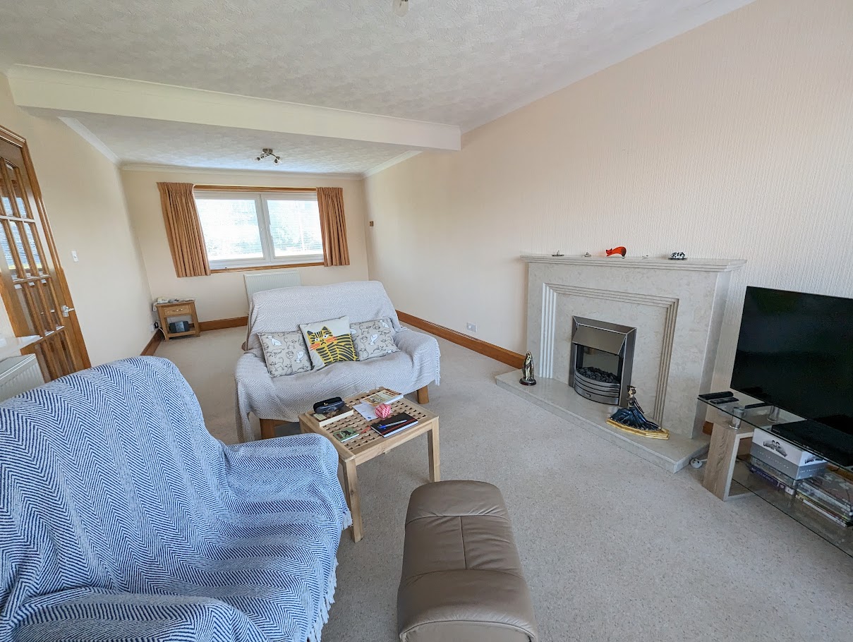 Bright and spacious living room/dining room with windows to the rear and patio door to the front opening up onto a balcony giving views over the River Nith. Electric fire with marble hearth and surround.