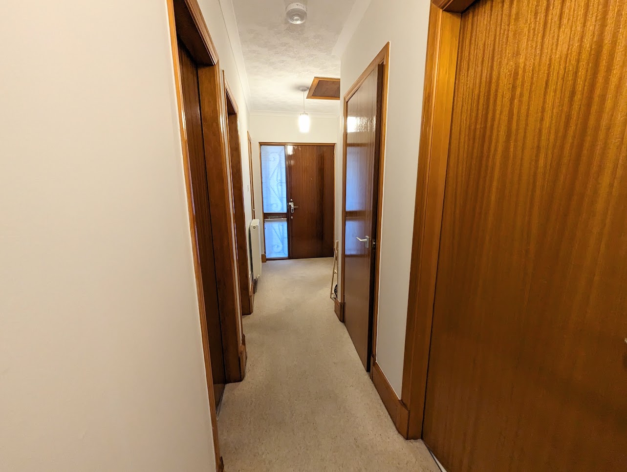 Entrance hallway with doors leading to all rooms. Three built-in cupboards, one housing Worcester boiler, one with electrics. Loft hatch.