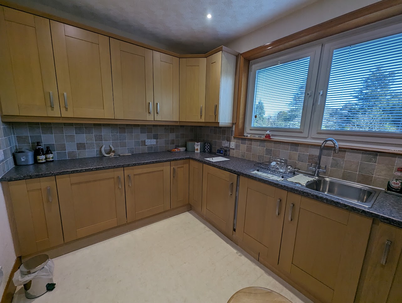 Kitchen with fitted wall and base units, sink with mixer tap and left hand drainer. Integrated fridge, freezer, washing machine electric oven (currently not working) and electric hob with extractor fan. Window to rear.