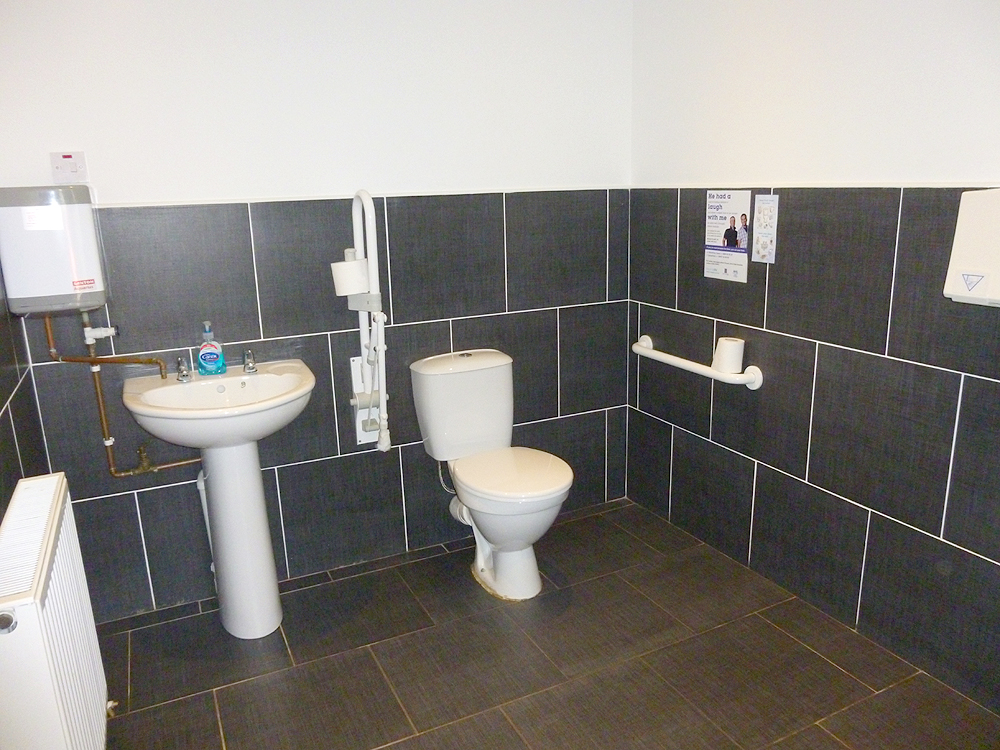 Partly tiled walls and floor. WC, wash hand basin, water heater, hand dryer and central heating radiator. Sunken ceiling lights, Xpelair.