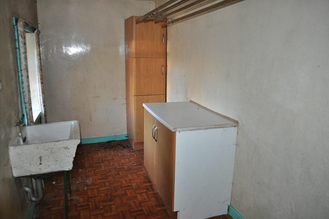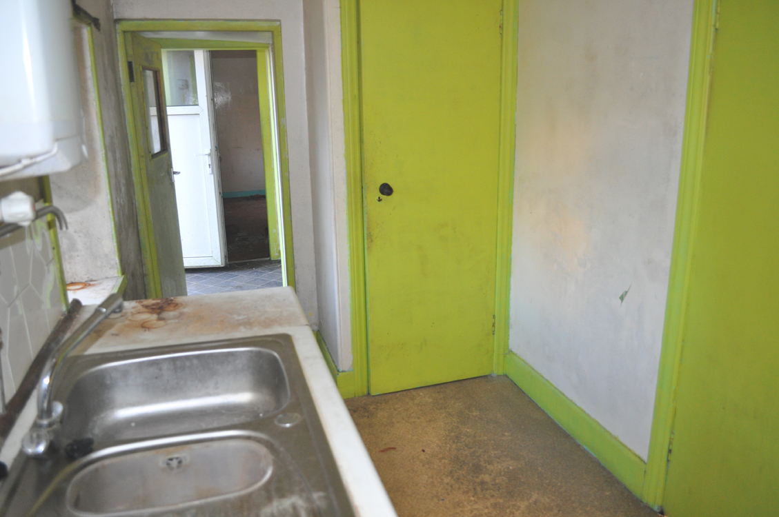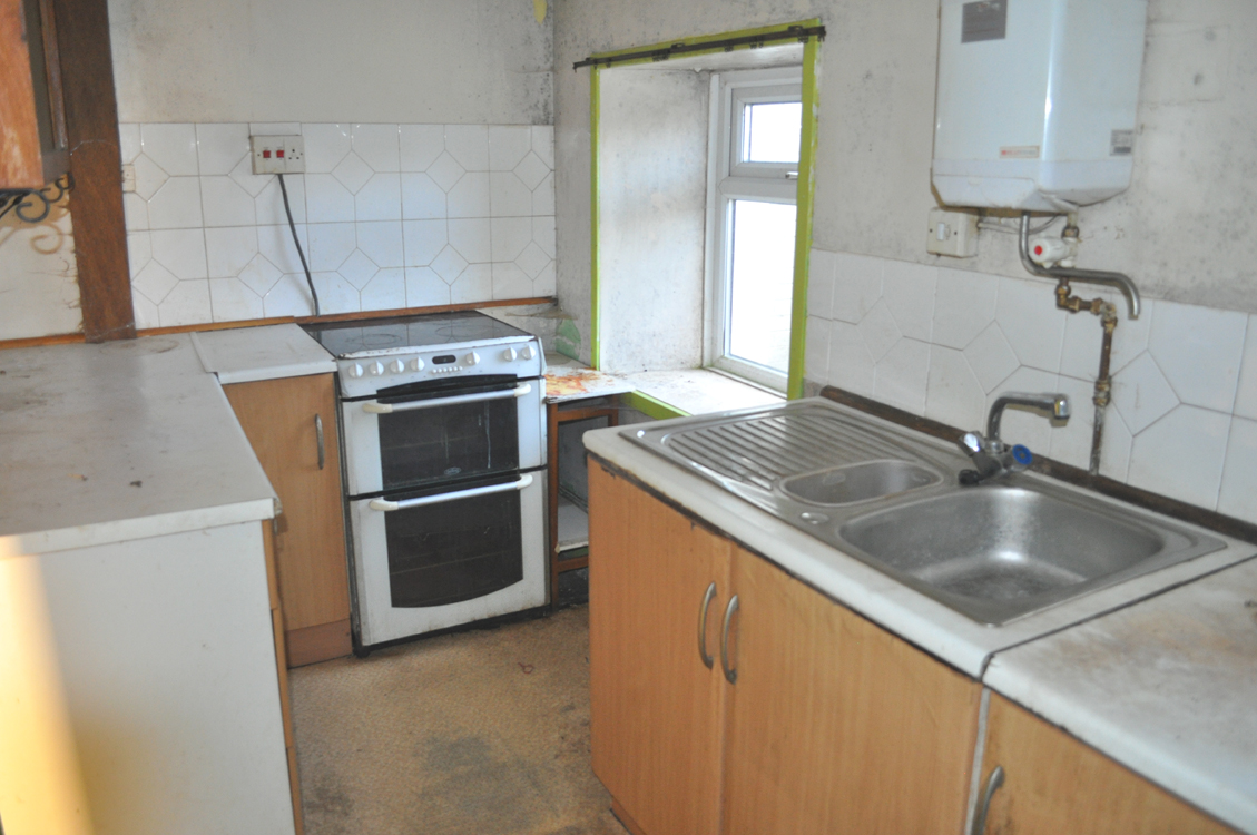 A range of work tops, base units and wall cupboards. 1 1/2 single drainer sink unit. Two double glazed windows with deep set sills. Shelved pantry cupboard. 2 power points. Cooker included in sale.