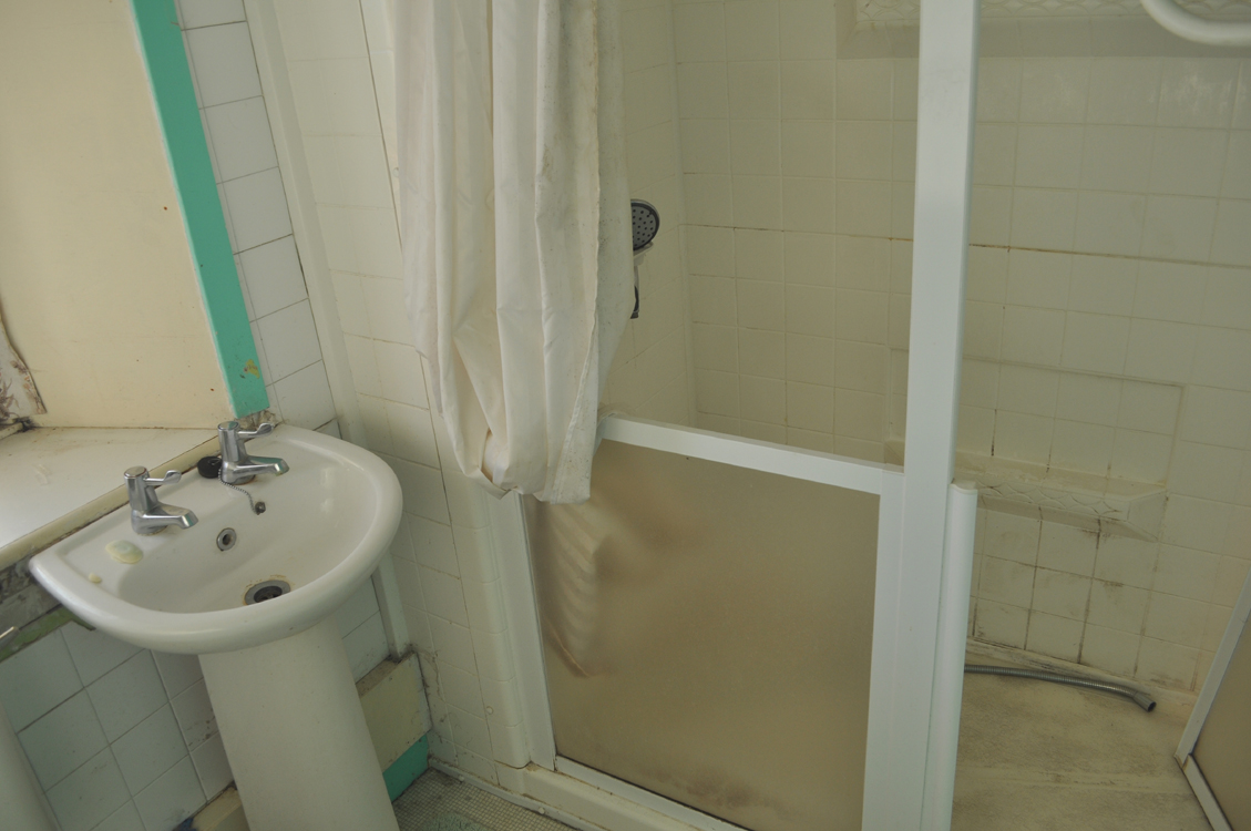 Shower cubicle with Mira Advance electric shower unit and tiled surround, WC and wash hand basin. Vinyl flooring. Double glazed frosted glass window with deep set sill.