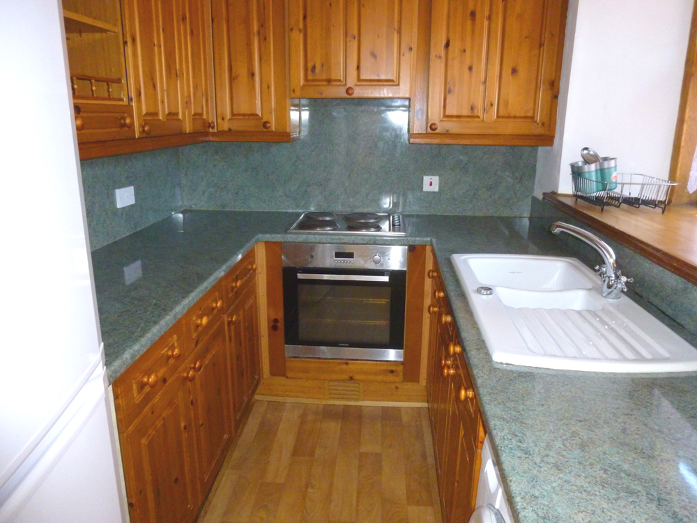 Good range of work tops, base units and wall cupboards. Integrated four burner electric hob with oven below and extractor fan above. 1 1/2 bowl single drainer sink unit. Double glazed window with deep set sill. Plumbed for washing machine. Wood effect vinyl flooring. 3 power points. Strip lights.