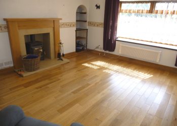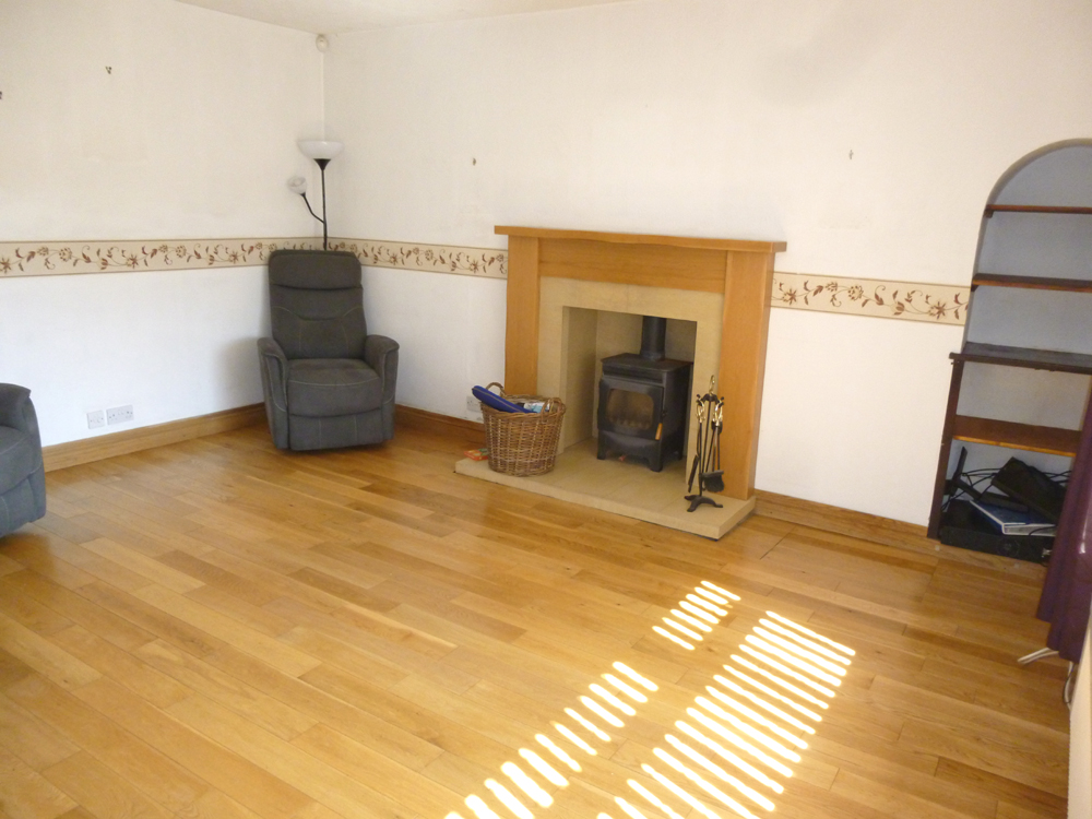 A feature of this room is the wood burning stove inset on tiled hearth and surround. Double glazed window to the front with fitted blinds and deep set sill. Shelved alcove. TV aerial point. Telephone point. Electric heater. Solid Oak flooring. 9 power points.