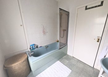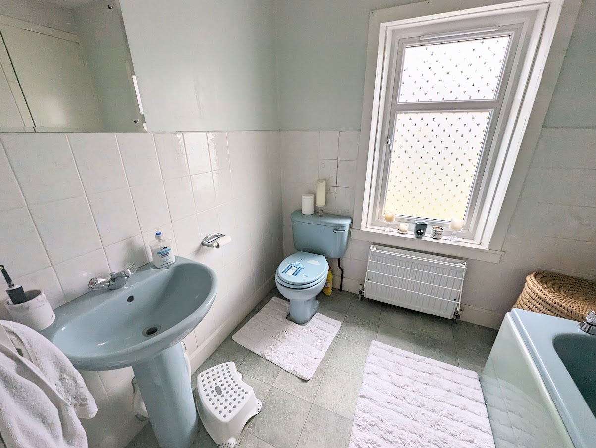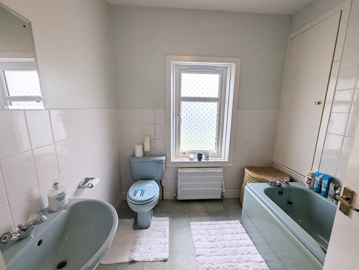 Family size bathroom with W. C., wash hand basin and bath with shower. Built-in cupboard. Window to the garden. Part tiled.