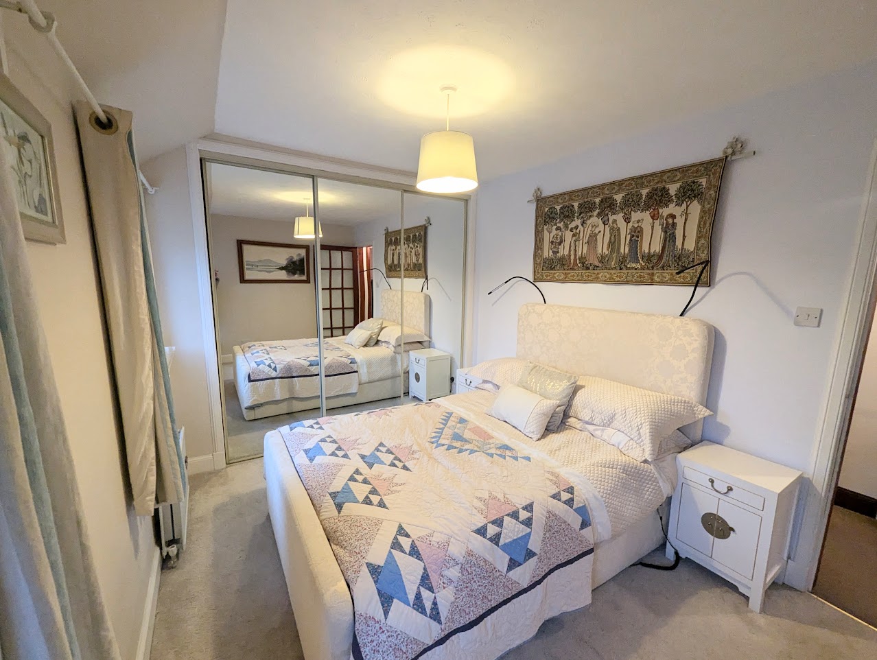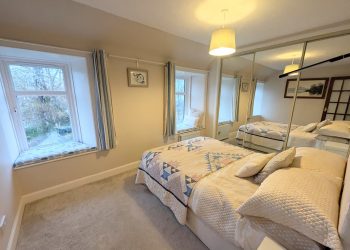 Bedroom two has two windows overlooking the garden. Fitted mirror fronted three door wardrobe with hanging rail and shelves.