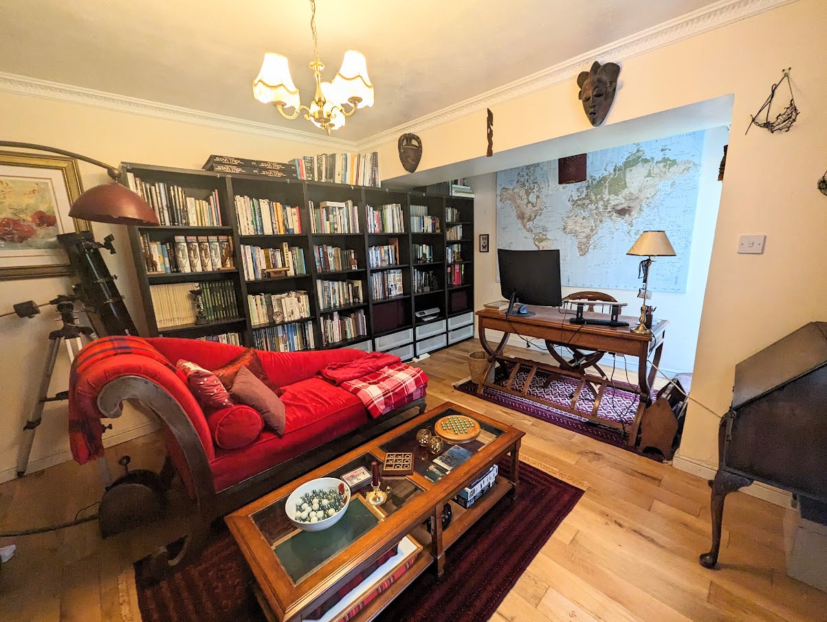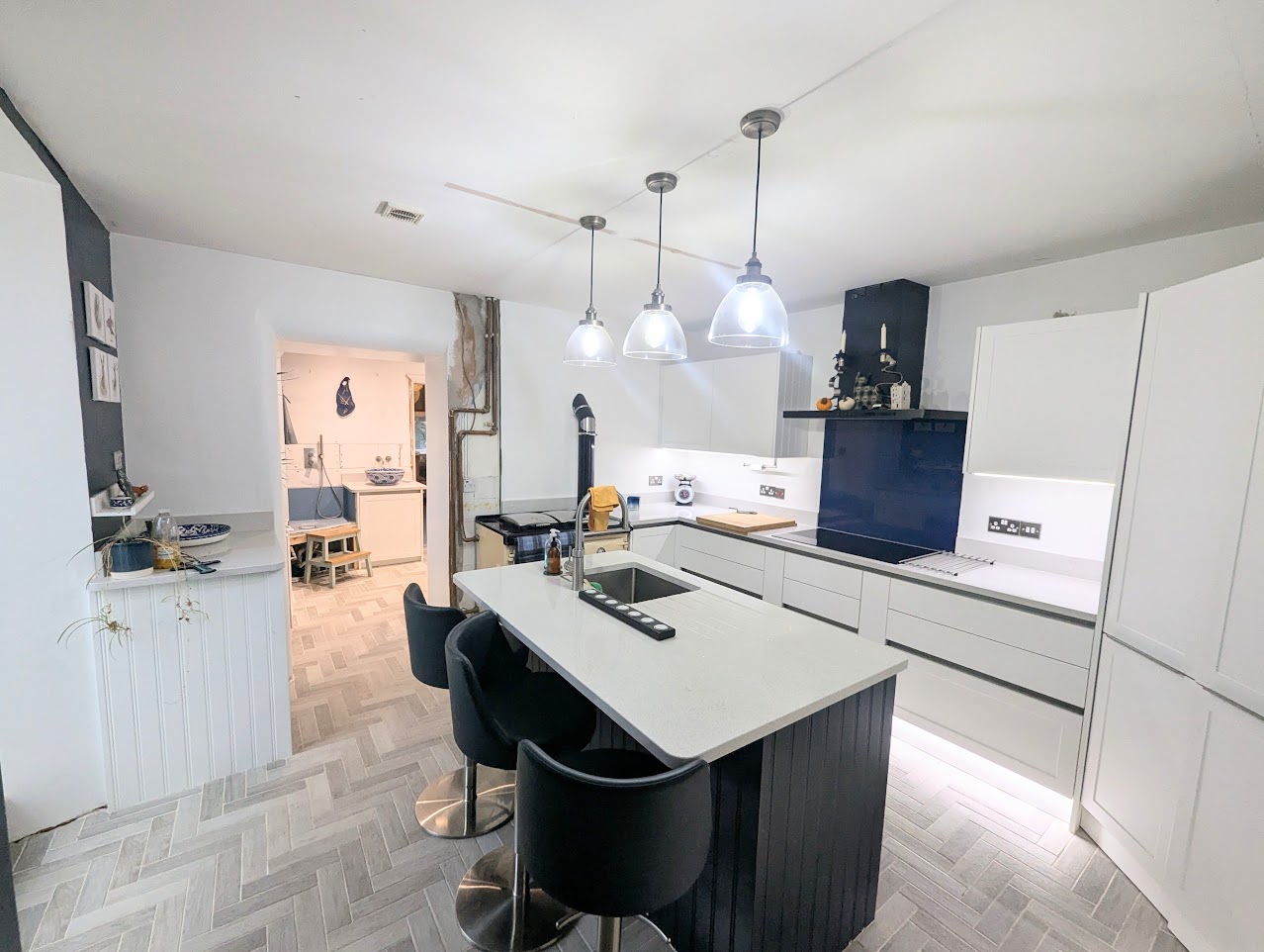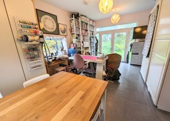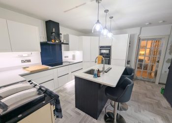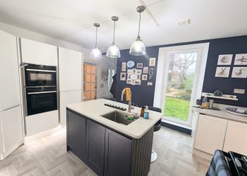Integrated double oven, 6 burner induction hob with extractor fan. The island has a sink with Quooker tap and left hand drainer. Door and window to the garden. Built in pantry with plenty of storage and automatic