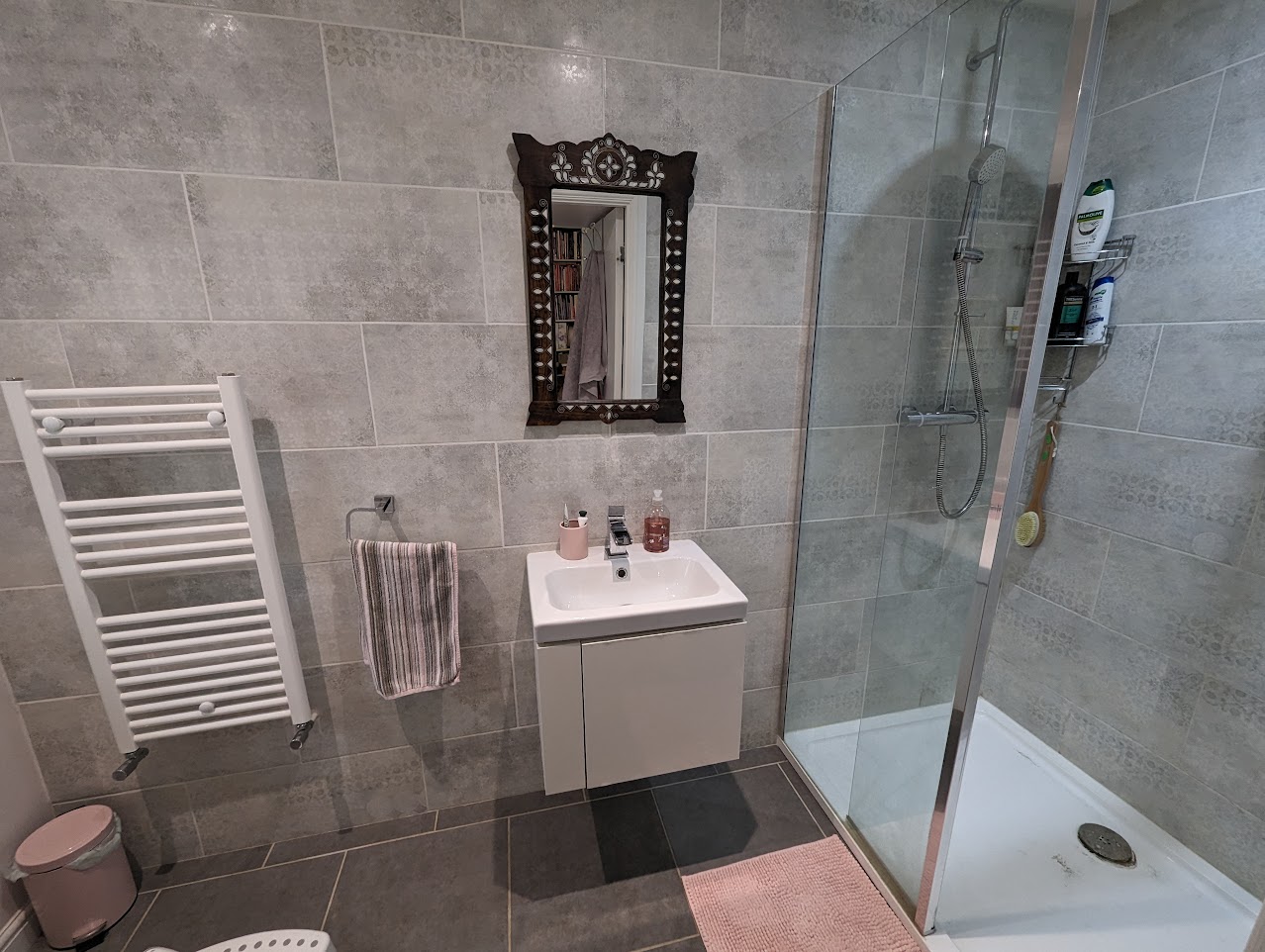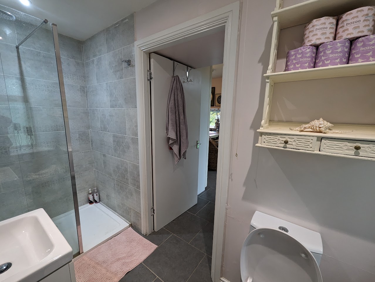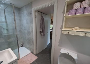 En-suite shower room with W. C., wash hand basin with mixer tap and storage. Walk-in shower with Thermostatic mixed shower. Window to garden. Part tiled.