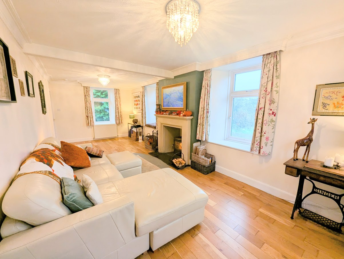 Generously portioned and bright living room with two window to the front and one to the side. Wood burning stove with stone mantel and hearth. Wooden flooring. Door to kitchen.