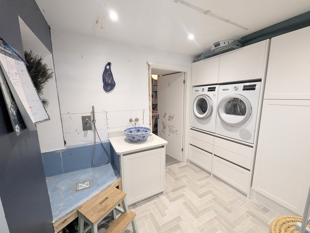 Utility room with fitted cupboards with ample storage, plumbed for washing machine and tumble dryer. Wash basin bowl with mixer tap and under storage. Draining area shower for washing pets.